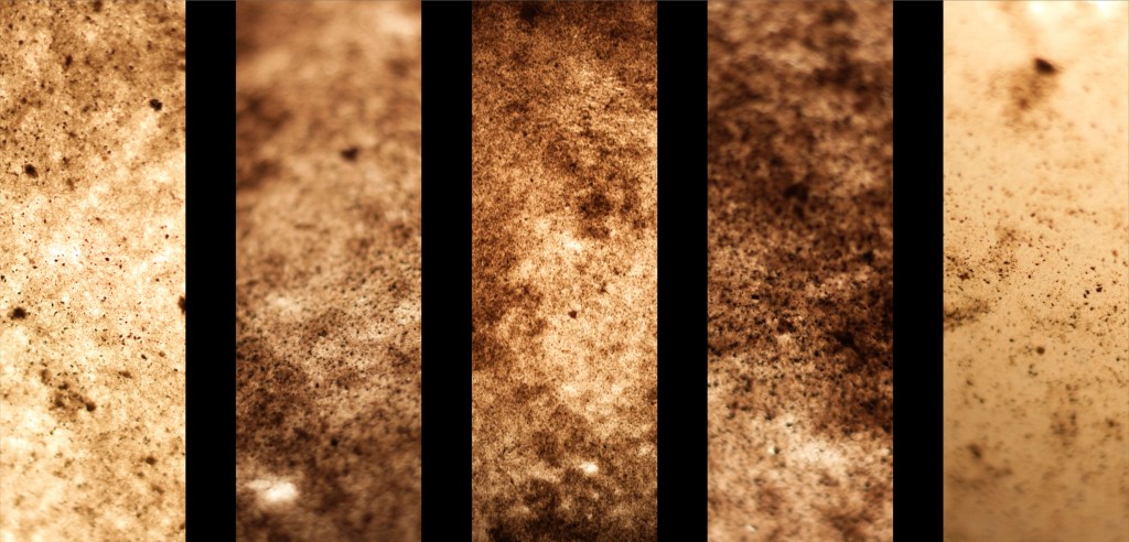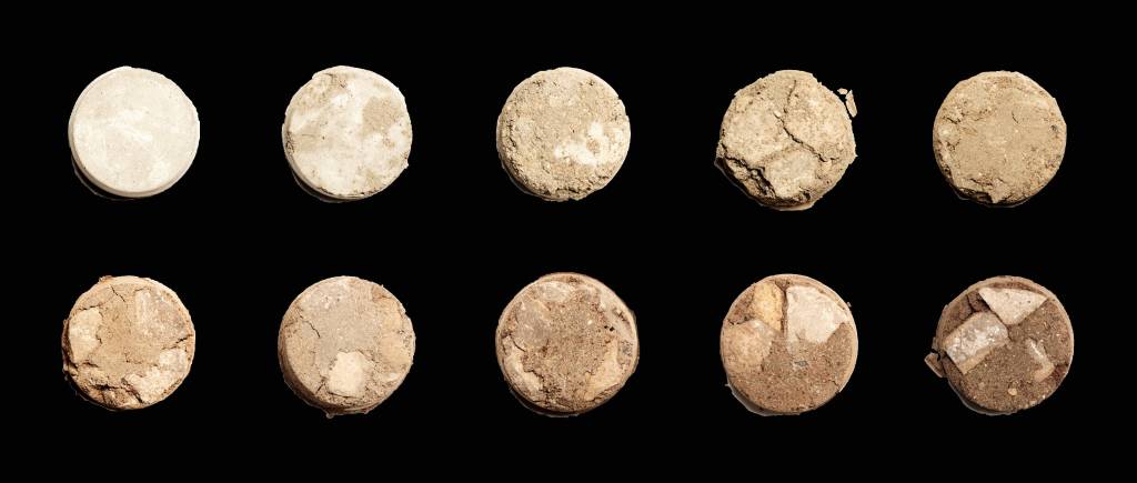 In an effort to integrate coffee into the construction, reduce coffee-ground waste, and provide a more sustainable alternative to concrete, aggregate in the composition was substituted with used coffee grounds. These material experiments detail integrity with different amounts of aggregate substitution (10% to 100%, left to right, top to bottom).