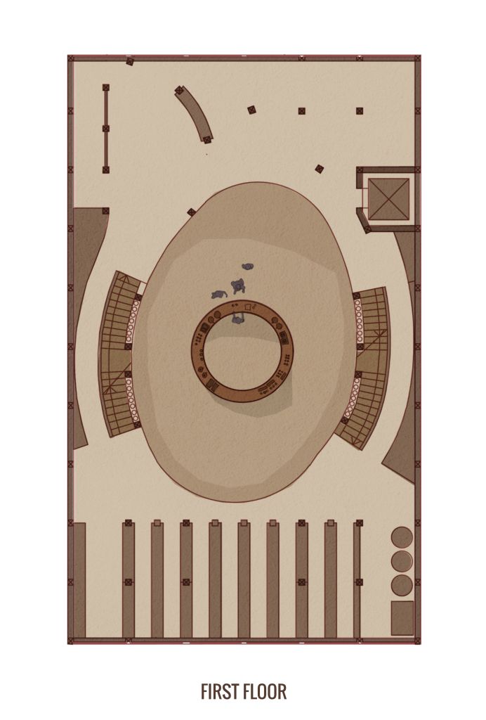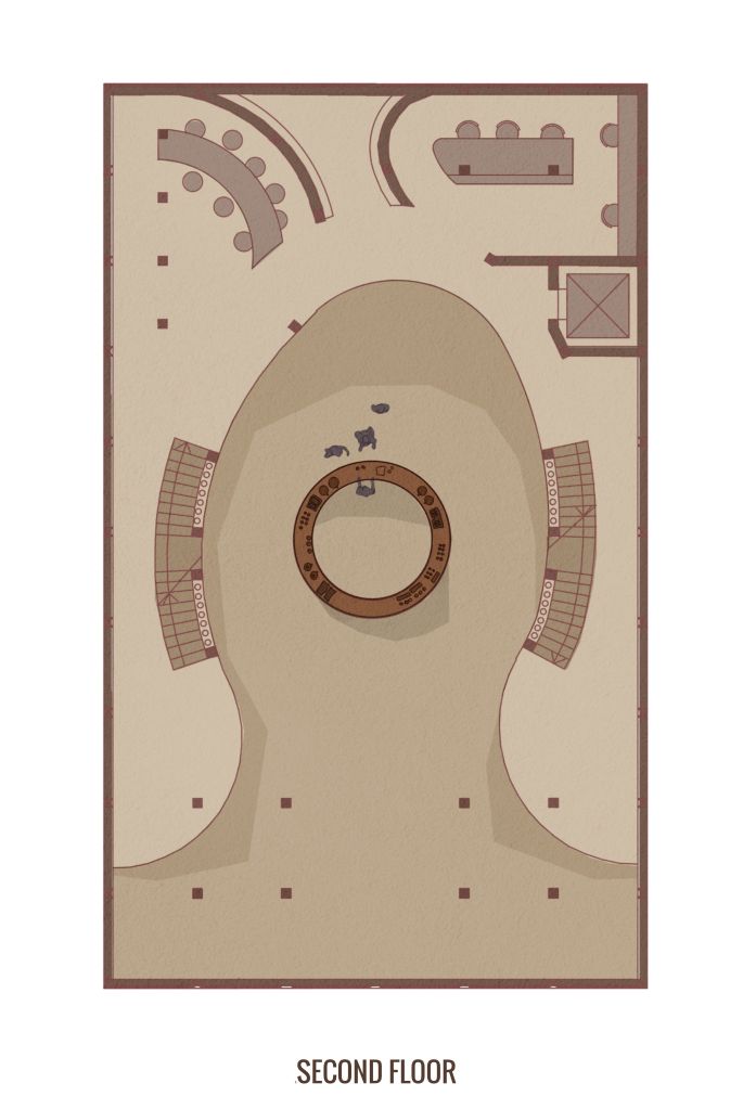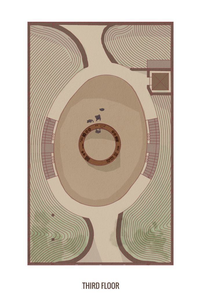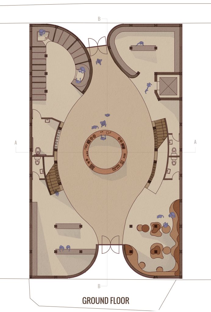 Highlighting the central atrium and organic geometries, the plan drawings show function from seating and serving at ground level, through roasting and workshop space, to bean growing at the top level.
