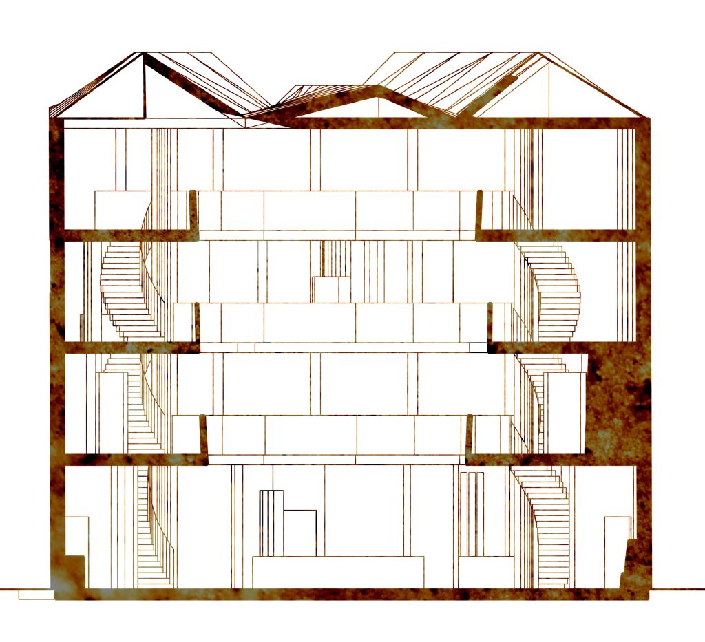 Drawing from the low-pitch skylight roofs of the adjacent warehouses, the central atrium lets light permeate the space from above, while rain collection systems channel water through pipework down next to the stairways.