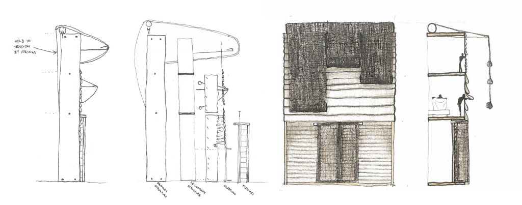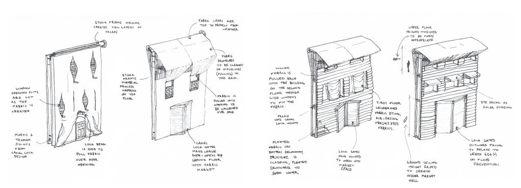 Initial sketch studies explored wrapping the facade in wool as it is made, both an effigy to the mechanised knitting process, and imitating a weather-shedding cladding system.